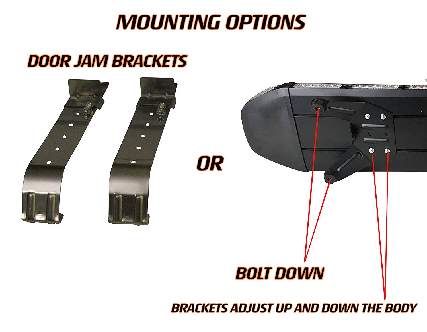 It's usually easiest to adapt the light bar to existing mount points. By simply loosening the bolts that hold the bracket to the body, you can slide the bracket up and down the channel. The legs are malleable and can be bent inward and outward to match existing mount points. It's usually easiest to adapt the light bar to existing mount points. By simply loosening the bolts that hold the bracket to the body, you can slide the bracket up and down the channel. The legs are malleable and can be bent inward and outward to match existing mount points.